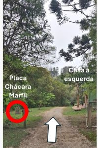 3) Mais adiante você encontrará um outro portão, onde está escrito Chácara Marfil na plaquinha do portão. Atravesse o portão e siga em frente. VocÊ passará por uma casa a esquerda, logo depois do portão e seguirá em frente.